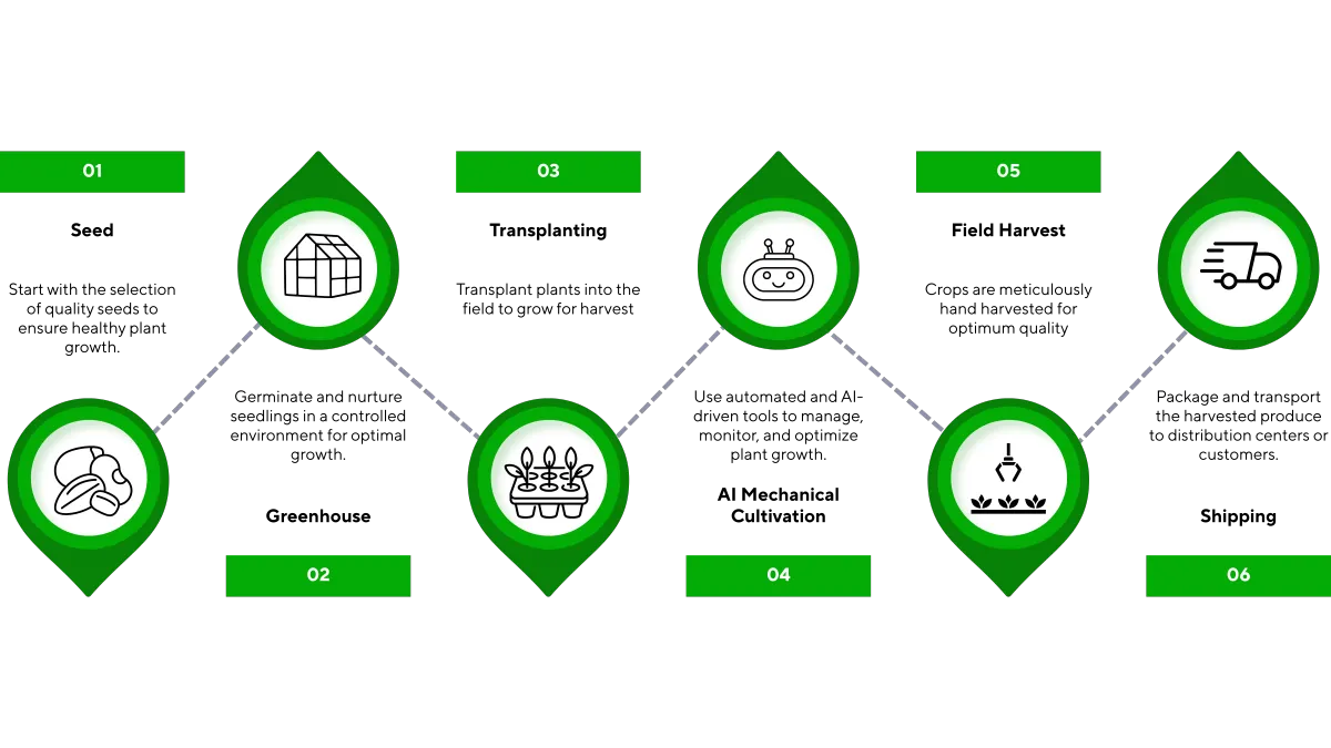 Smart greenhouses, AI cultivation, PlantTape systems, and modern equipment.